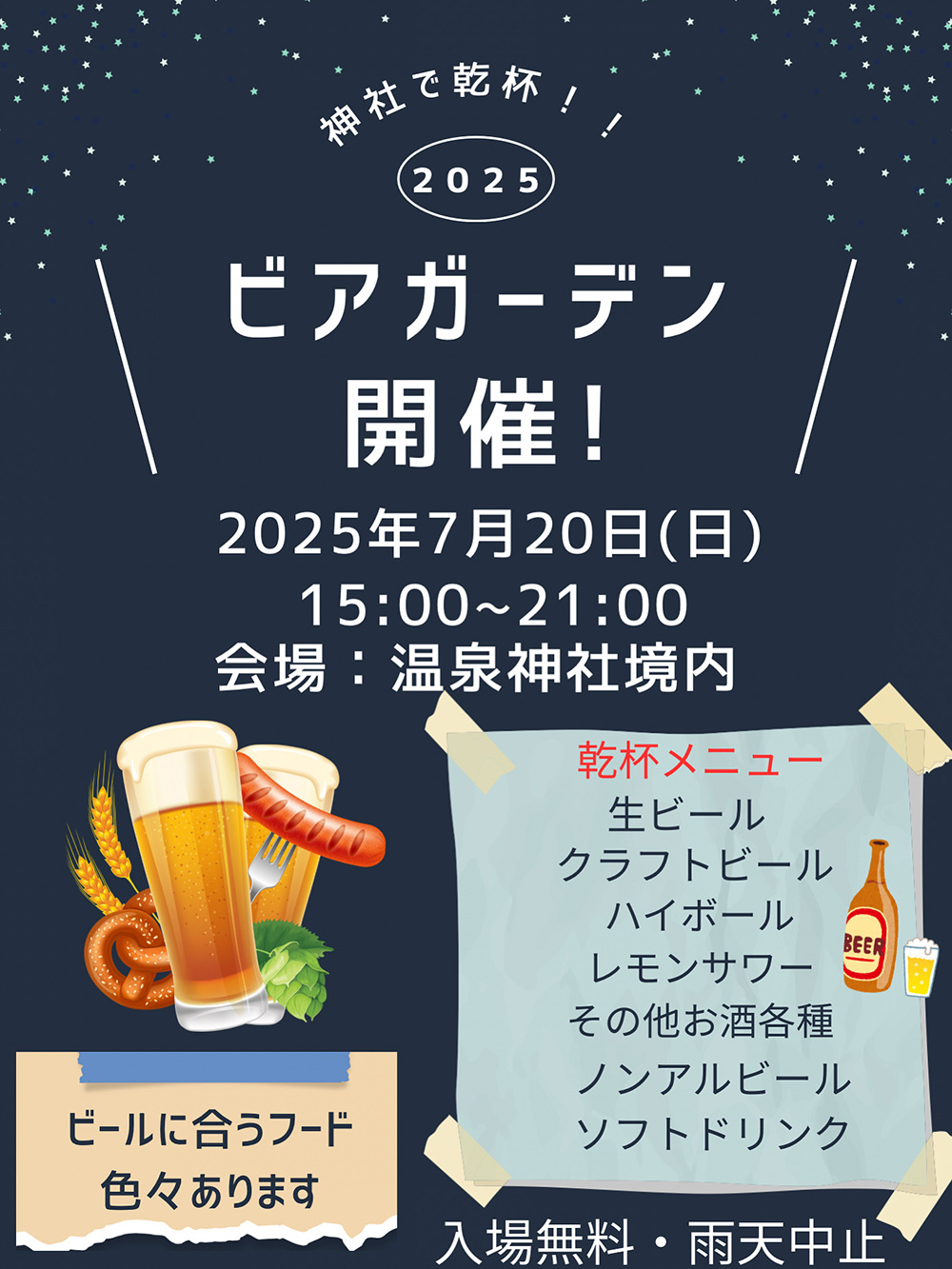 温泉神社の境内にてビアガーデンを開催します!