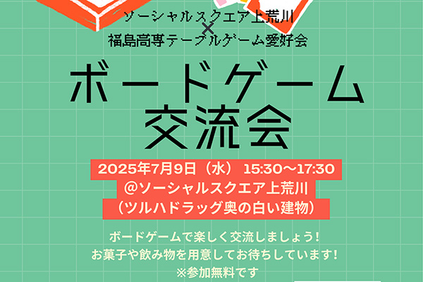 ▼イベント名 ボードゲーム交流会 ▼日時 2025年7月9日(水)15:30〜17:30 ▼場所 ソーシャルスクエア上荒川 ▼内容 ボードゲームで楽しく交流しましょう! お菓子や飲み物を用意してお待ちしています✨ 参加無 […]