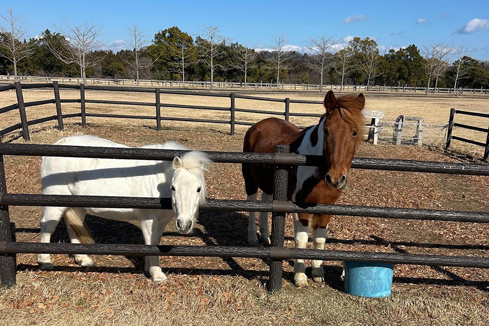 ふれあい広場では、放牧されているポニーとふれあえます(月曜定休&不定休あり)。